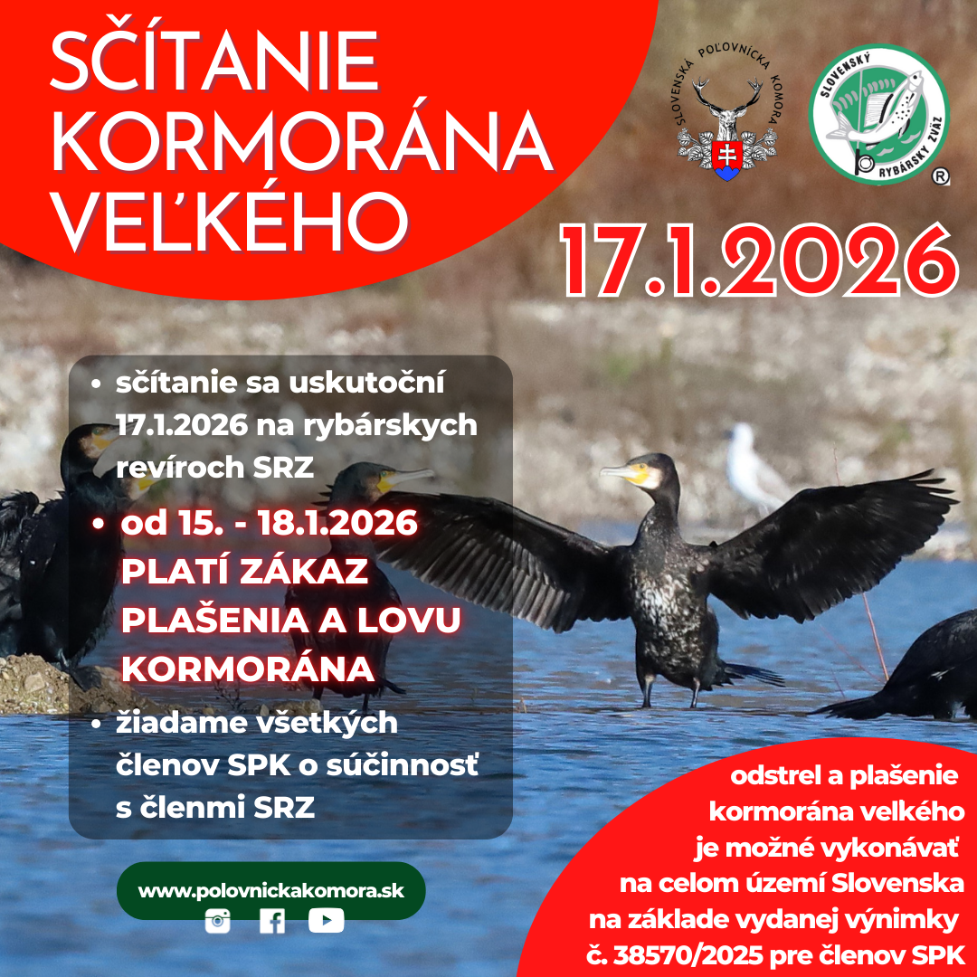 Slovenský rybársky zväz nás požiadal o súčinnosť pri informovaní celej členskej základne SPK o tom, že dňa 17. januára 2026 bude na rybárskych revíroch Slovenského rybárskeho zväzu prebiehať sčítanie kormorána veľkého na nocoviskách a to v čase od 14,00 do 17,00 hod.